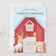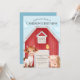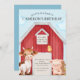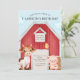 Este convite de festas personalizado apresenta um tema de fazenda giro, estilo aquarela. Uma imagem de um grande celeiro vermelho é colocada em segundo plano, com animais de fazenda bonitos em pé na frente. À direita está um porco bebê, e à esquerda está uma vaca bebê. Um pequeno pintinho está empoleirado na porta.