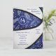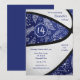Este convite de aniversário de basquete fofo apresenta a imagem realista de uma bola de basquete estilizada e superdimensionada de forma abstrata, com painéis alternados azuis e brancos recoloridos - um padrão de desenho de paislies, flores e penas em branco cobre os painéis azuis da bola de basquete - personalize com os detalhes da festa dela - por katz_d_zynes