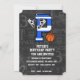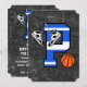 Divertido design de basquete para o jovem jogador de basquete ou fã de basquete. Destaque a letra P nas cores azul e branco da equipe com basquete e bola de basquete. O fundo apresenta design de quadro negro com termos e imagens de basquete
