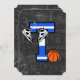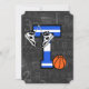 Design divertido de basquete para o jovem jogador de basquete ou fã de basquete. Apresenta a letra T nas cores da equipe azul e branco com sapatos de basquete e basquete. O fundo apresenta design de quadro negro com termos e imagens de basquete