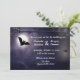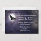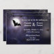 Aqui está um design assustador com um fundo de teia de aranha e texto de casamento de Halloween. Um morcego preto voador com asas estendidas é centrado em frente a uma lua branca e brilhante. Um bar de ornamentado está no topo com uma aranha saindo do bar. No canto esquerdo há outra teia de aranha com uma aranha pendurada numa corda. O fundo é uma mistura assustadora de azul, cinza, vermelho de sangue escuro e cinzas legal brilhando. Teve um evento temático no Halloween? Fácil de personalizar o texto para atender às suas necessidades. Texto é uma mistura de uma fonte gótica e um script pesado.