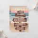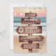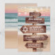Convites de bat mitzvah temáticos do oceano com uma praia arenosa de luxuriante pôr do sol, luzes cintilantes e sua redação escrita em um letreiro de madeira rústica.