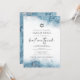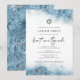 Este convite elegante para bat mitzvah apresenta um desenho de borda aquarela azul claro imitando mármore com veias de folha de prata falsa, desvanecendo-se gradualmente no fundo branco. As palavras "bat mitzvah" aparecem em escrita à mão em cinza carvão, com o texto restante em letras maiúsculas serifadas. O padrão de mármore azul e prata é repetido no verso do cartão.