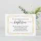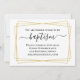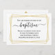 Elegante ADULT BAPTISM convite com bordas de caixa douradas e tipografia de script decorativo. Você pode adicionar seus detalhes de data e hora na frente. Ao contrário, há uma simples cruz dourada, além de detalhes personalizáveis de local e RSVP. Há também um verso Bíblia opcional de 2 Corinthians 5:17 (Nova criação no Cristo) que você pode substituir por sua mensagem pessoal.
