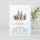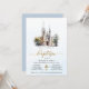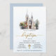 Clássica azul-aquática moderna e elegante, Convocação Batismo. A design inclui uma ilustração aquarela de uma igreja, uma escritura elegante em ouro para a palavra "Batismo", uma cruz de ouro, e bloqueie letras maiúsculas para a informação de celebração. Para alterar as cores e fontes, escolha editar este design para abrir mais as opções adicionais de personalização.