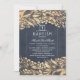 Convite Batismo Azul-Marinho Elegante de Folhagem Dourada