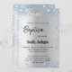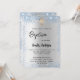 Um batismo moderno e elegante, celebrando um menino. Fundo metálico de aspecto fino prateado decorado com brilho azul, faíscas e uma cruz ouro. Personalize e adicione um nome e detalhes da parte. Letras pretas coloridas.