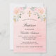 Um batismo moderno e elegante, celebrando uma menina. Um fundo cor-de-rosa pincelado decorado com pequenos brilhos de ouro, pontos e uma cruz de ouro. Flores brancas e cor-de-rosa e verde de eucalipto. Personalize e adicione um nome e detalhes da parte. Letras pretas coloridas. Script elegante