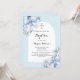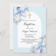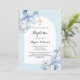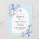 Um quadro de arco branco e fundo azul claro. Decorado com flores e arcos azuis e brancas. Uma cruz ouro. Personalize e adicione um nome e detalhes.