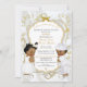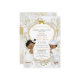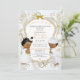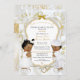 Linda menina e garoto em suas roupas batizantes com colar de cruz de ouro. O fundo do convite é o cetim branco, o filigre dourado, uma moldura dourada e prateada e um embelezamento do arco. A parte de trás é enfeitada com padrão de flores douradas e fita dourada sobre fundo branco de cetim.