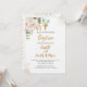 Para o batismo de 2 duas crianças. Um fundo branco decorado com folhagens de eucalipto, uma rosa branca e folhas douradas e gotas de glitter dourado falso. Personalize os nomes das crianças e detalhes da cerimônia. Letras pretas e douradas. Gênero neutro.