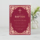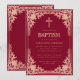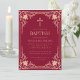 Este elegante convite de batismo em burgundy e rosa / dourado rosa com um ar vintage, recomendado para uma menina, tem uma moldura ornamentada (falsa) em dourado rosa com elegantes decorações barrocas em rosa sobre um fundo burgundy. Acima do texto há uma cruz religiosa em dourado rosa. Exceto a ocasião "Batismo", que também está em dourado rosa, todo o texto pode ser personalizado e tem uma cor rosa semelhante à moldura em dourado rosa.