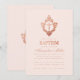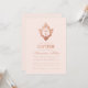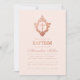 Este convite de batismo rosa e dourado-rosado com um ar vintage, recomendado para o batizado de uma menina, tem um brasão floral vintage com uma cruz, em folha de ouro rosa (falso). O nome da menina é escrito em uma fonte caligráfica elegante. Todo o texto pode ser personalizado e tem uma cor semelhante ao brasão dourado-rosado. O fundo é rosa suave.