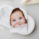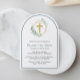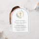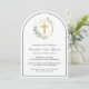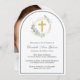 Um convite de batismo elegante em forma de arca com a ilustração aquarela de uma cruz dentro dourada, uma faixa geométrica de coroa dourada, enfeitiçada com eucalipto verde sábio verde verde verde verde-verde-verde-verde-verde-verde-verde-caligrafia, o nome do seu filho num roteiro caligráfico verde-sábio e os detalhes do convite em uma tipografia simples e moderna moderna. A foto deles preenche a parte de trás do cartão.