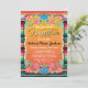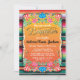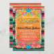 Colorida Fiesta Baptism e Convite de festas mexicana. Apresenta papel picado brilhante inspirado em flores, sotaques dourados brilhantes e um fundo do tapete mexicano asteca.