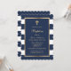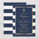 Um convite de batismo elegante, de listras brancas e azuis, que mostra uma cruz de ouro, uma armação e pequenas estrelas.