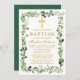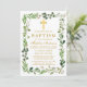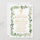 O Convite ao Batismo Elegante Moderno inclui folhas de cor aquosa de eucalipto e outras lindas folhagens botânicas verdes. Dourada Cruz.