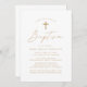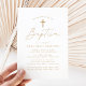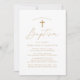 Os simples convites para batismo apresentam um roteiro casual de caligrafia dourada com fundo branco para um design perfeito para um batismo moderno para bebês. Personalize os convites elegantes do batismo com o nome do seu filho e os detalhes do evento religioso abaixo. O verso do convite fornece espaço para texto e fotos adicionais.