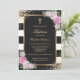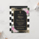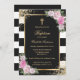 Um convite para batismo floral, branco e preto, com listras brancas, que inclui rosas rosa pinceladas e uma cruz de ouro.