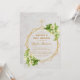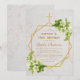 Este convite de batismo e primeiro aniversário floral geométrico elegante tem uma moldura irregular dourada com buquês de lírios brancos (e outras flores brancas menores) para cima e para baixo à esquerda sobre dois hexágonos dourados que se sobrepõem a um fundo de mármore branco, com uma cruz dourada no topo. O nome da criança é escrito em uma fonte caligráfica elegante. Todo o texto tem uma cor amarela dourada, como a moldura dourada.
