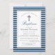 Um Clássico com um toque de um Convite Batismo moderno para meninos. A design apresenta um fundo de listras em marinho azul e branco, uma bela cruz de prata de cinza, "Batismo" na tipografia clássica, e todas as informações sobre o evento em cinzas escuras. Personalize com os campos de modelo fornecidos ou clique em personalizar para mais opções de edição.