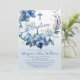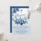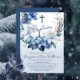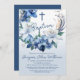 Design de Batismo, design de coroa floral, azul e branca, elegante. Possui texto de script de aparência manuscrita, bem como estilos de texto de estilo sans serif em azul escuro em um fundo azul claro a azul claro para emparelhar perfeitamente com o buquê de estilo de wreath floral semicircular azul e branco.
