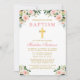 O Convite para Batismo Floral de Blush Blush de Aquarela Elegante inclui rosas rosa, flores brancas e verde. Dourada Cruz.
