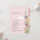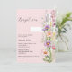 Um fundo cor-de-rosa pincelado, com uma cruz branca decorada com flores rosa e roxas. Personalize e adicione o nome e os detalhes.