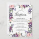 Uma floral roxa de ameixa empoeirada tem belos sotaques rosas cor-de-rosa. Muitas culturas verdes, folhas e vinhas mantêm-no aberto e arejado. Batismo é escrito em um roteiro fluente. O nome da menina está escrito em letras clássicas de serifa. O fundo do convite é um roxo profundo. Este bonito modelo de batismo é muito fácil de personalizar.