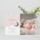 O convite para o batismo de uma garota fotógrafa mostra um fundo rosa pincelado com estrelas falsas douradas, lua crescente e nuvens brancas. O verso apresenta padrões de pontos aleatórios dourados falsos em fundo branco. Personalize para suas necessidades. Você pode encontrar mais produtos correspondentes na minha loja.