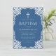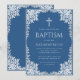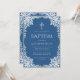 Este convite de batismo azul clássico com ar vintage, recomendado para menino, tem uma moldura ornamentada em folha de prata falsa com folhas cinza prateado em um fundo azul clássico. Acima do texto há uma cruz religiosa em folha de prata falsa. Todo o texto pode ser personalizado e tem uma cor cinza semelhante à moldura de prata falsa.