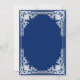 Este convite de batismo azul e prata com um ar vintage, recomendado para um menino, tem uma moldura ornamentada em folha de prata falsa com elegantes decorações cinza prateado barroco sobre um fundo azul real. Acima do texto há uma cruz religiosa em folha de prata falsa. Exceto a ocasião "Batismo", que também está em prata falsa, todo o texto pode ser personalizado e tem uma cor cinza prateado semelhante à moldura de prata falsa.