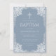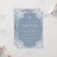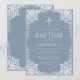 Este elegante convite de batismo azul empoeirado com ar vintage, recomendado para um menino, tem uma moldura ornamentada em folha de prata falsa com folhas cinza prateado sobre um fundo azul empoeirado. Acima do texto há uma cruz religiosa em folha de prata falsa. Todo o texto pode ser personalizado e tem uma cor cinza semelhante à moldura de prata falsa.