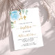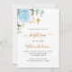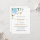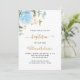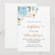 Um fundo branco decorado com folhagem de eucalipto, uma rosa azul clara e folhas douradas. Personalize com o nome da criança e detalhes da cerimônia. Letras pretas e douradas.