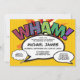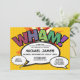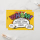 Um convite de batismo, baptizado inspirado em banda desenhada fixe, fixe e na moda que põe o wham, zap, pow na celebração do seu super-herói. O verso apresenta um padrão de bolinhas de banda desenhada e uma bolha de fala para detalhes adicionais do evento e endereço. Concebido por Thisisnotme©
