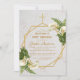 Este convite de batismo e primeiro aniversário floral geométrico elegante, recomendado para menina, tem uma moldura irregular dourada com buquês de lírios calla brancos e feto à direita e à esquerda sobre dois hexágonos dourados que se sobrepõem a um fundo de mármore branco, com uma cruz dourada no topo. O nome da criança é escrito em uma fonte caligráfica elegante. Todo o texto tem uma cor amarelo-dourado, como a moldura dourada.