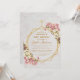 Este convite de batismo e primeiro aniversário floral elegante tem uma moldura irregular dourada com buquês de orquídeas brancas e rosadas para cima e para baixo sobre dois hexágonos dourados que se sobrepõem a um fundo de mármore branco, com uma cruz dourada no topo. O nome do bebê é escrito em uma fonte caligráfica elegante. Todo o texto tem uma cor amarelo-dourado, como a moldura dourada.