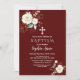 Design de cartão elegante com cor d'água, flores brancas delicadas e douradas esboçadas, flores, folhas, cruz branca, sobre fundo burgundy. Na parte de trás buquê e cruz flores brancas. Use a ferramenta Personalizar para adicionar suas informações, alterar fontes, cores da fonte. Para obter itens correspondentes, visite minha nova coleção de celebrações Baptism/Christening.