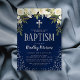 Convites modernos de batizado/batismo com fundo azul marinho que pode ser alterado para qualquer cor, brilho prateado espalhado elegante, uma cruz religiosa, uma exposição floral e um modelo de texto fácil de personalizar.