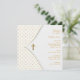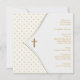 Convite de batizado e batismo de menina com bolinhas cor-de-rosa elegantes, cruz branca e dourada.