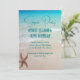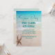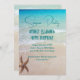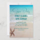 Beach scene and starfish surprise party invitations for celebrating a milestone birthday. Tropical sea water and beach sand is the background for text. The first lines are large print for party type. Change it as needed for a birthday party, graduation party, retirement, or summer gathering. The second line is script for name and age, or change it as needed. The two remaining templates are for party information and rsvp. Reverse also has a seashore image.