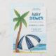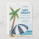 Beach-themed baby shower invitation featuring a palm tree and a striped umbrella on sand with blue ocean waves. Text details event info in blue font.