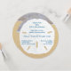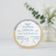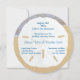 Sand dollar wedding invitations in a round shape. Sea blue text templates over a white sand dollar image. The background is beach sand with a little water coming ashore. Modern printed fonts with names of the couple in script.