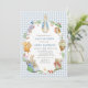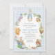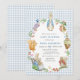 Celebrate your little one's arrival with this enchanting Beatrix Potter-inspired baby shower invitation! Featuring adorable watercolor illustrations of Peter Rabbit, squirrels, mice, owl, and other beloved woodland friends arranged in a delicate floral wreath on a soft blue gingham background. Perfect for a whimsical, vintage storybook-themed shower.
