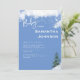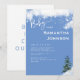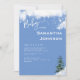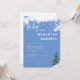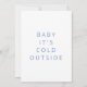 Convite para chás de fraldas. Informação na frente e atrás. Neve. Árvores de inverno. Querida, está frio lá fora. Fundo branco e azul. Texto branco.
