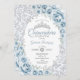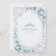 Convite para comemoração de Quinceanera, azul e prata. Recursos, fontes de script, borboletas prateadas, rosas de aquarela e tiara. Perfeito para uma elegante celebração de glam estilo princesa. Personalize com seus próprios detalhes. Impressos convites Zazzle ou modelo de impressão digital instantânea para download.