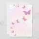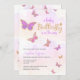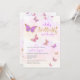 Uma borboleta bebê está no caminho do convite para Chás de fraldas de borboletas com lindas borboletas roxas de ouro rosa e tipo de caligrafia de script.
