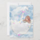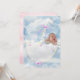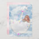 Menina flutuando num guarda-chuva nas nuvens com fitas.