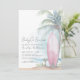 "Baby On Board" traz um clima alegre e praiano para este convite de chá de bebê, apresentando um deslumbrante fundo em aquarela. O design inclui uma palmeira alta, uma prancha de surf rosa descansando na costa arenosa, ondas suaves do oceano, um céu azul brilhante e plantas verdes exuberantes perto da parte inferior. A prancha de surf rosa adiciona um toque doce, tornando-a ideal para celebrar uma menina, embora ainda seja versátil o suficiente para um tema neutro em termos de gênero, graças às suas cores complementares e equilibradas.