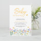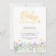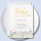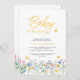 Você está planejando um chá de fraldas exclusivo? Este charmoso convite floral inclui flores silvestres e borboletas. Sua tipografia na moda amarela diz "Baby in Bloom." Facilmente personalizável. Original Watercolor © Michele Davies.